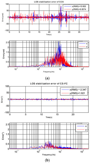 Furthermore, CS-FC was employed by a ship-based EOTS, and the LOS stabilization precision in real marine environment was tested. The LOS error of CCS and CS-FC are shown in Figure 9and Table 2. The result shows that CS-FC effectively improved LOS stabilization precision. Compared to the frequency spectrum of Figure 9a,b it is clearly seen that the disturbance rejection performance of CS-FC is almost equal to CCS below 2 Hz and has been improved above2 Hz, especially from 5 Hz to 20 Hz, where the main errors of CCS occur.