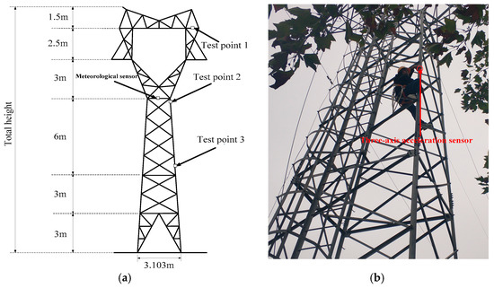 The transmission tower studied in this paper is a ZM-110 kV cat head tower which is built in Xi’an Polytechnic University. The LGJ-95/15 conductors are installed on the tower and the direction of the lines are north-south. The cat head tower’s total height is 19 m and the root is 3.103 m, as shown in Figure 1a.