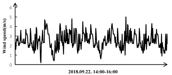 In order to prove that the modal frequencies of the transmission tower system can be well extracted by modal identification, the transmission tower in this paper was measured and analyzed at 14:00 on 22 September, 2018. At the same time, the tower settlement experiment platform was built to simulate the settlement process of single tower foundation, and the low-order modal frequencies of the transmission tower system before and after settlement were extracted and analyzed. The weather was sunny, with a south-east wind and wind level of 3–4. The sampling frequency of the three-axis acceleration sensor was set to 200 Hz and the sampling time was 30 min because the low-order modal frequency of the tower is within 1–15 Hz [18]. Figure 2 shows the wind speed history curve measured by the meteorological sensor during the test period.