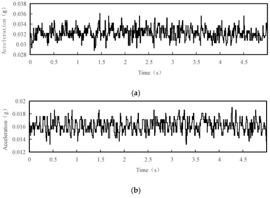 Considering that the tower vibration is not a free vibration in single direction, the three-axis acceleration sensor was used to monitor the acceleration signals in the X, Y and Z directions of the tower in this paper; these signals were processed and analyzed separately. Figure 3 shows the acceleration time history curves for a 5 s interval in the X, Y and Z directions of test point 1 under normal conditions.