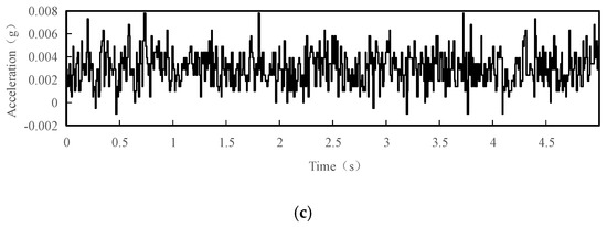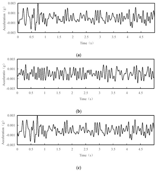 Acceleration time history curves with 5 s interval of the test point 1 under normal conditions: (a) acceleration time history curve in the X direction; (b) acceleration time history curve in the Y direction; (c) acceleration time history curve in the Z direction.
