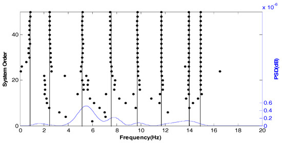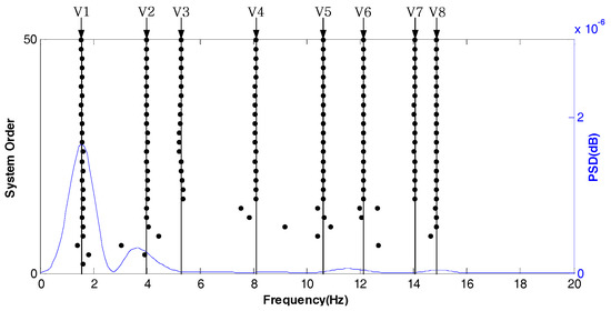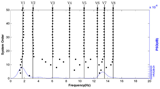 Figure 5 shows the stabilization diagram in the X direction of test point 1 under normal conditions. Its abscissa represents the modal frequency and V1–V8 represent the eight modes of the tested tower system, respectively. According to the requirements of the stability axis, , where is the modal order, is the modal frequency and is the modal frequency limit parameter. The stability of the system can be determined by the intensity of the points on the stable axis. As shown in Figure 5, even if the power spectral density (PSD) is not prominent, the eight modes in the X direction can be well analyzed and the modal frequency is also stable.