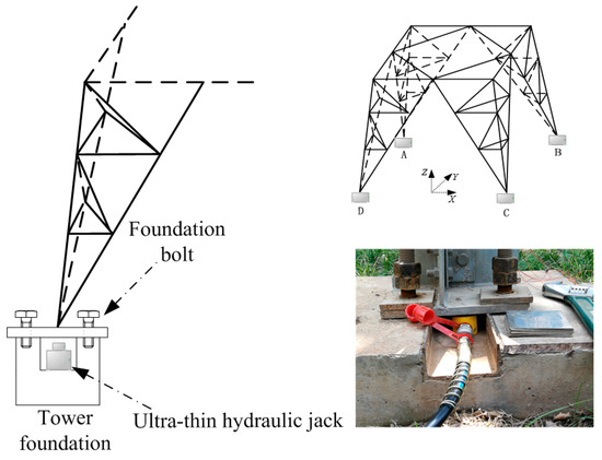 Transmission tower settlement is caused by its foundation and underground soil, which is uniform or uneven. Under uneven settlement, the height difference of the four tower foundations may cause a large change in the force of the transmission tower, which also causes the stiffness and the modal frequency of the tower system to change. Since a damage test cannot be carried out, the process of tower foundation settlement cannot be readily simulated. Therefore, a hydraulic jack was used to raise the tower foundation, which alters the height of the tower foundation and verifies the feasibility of the proposed method.