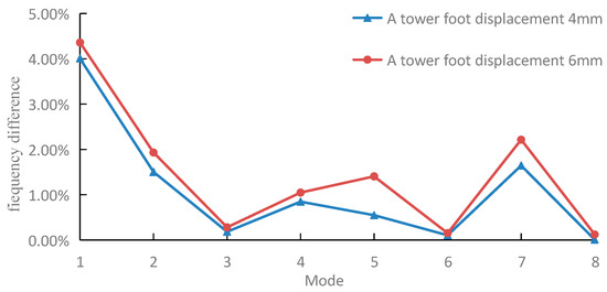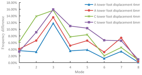 In order to ensure that the low-order modal frequency in the X direction can be used as evidence for tower foundation settlement, we carried out the settlement experiments of 4 mm and 6 mm on tower foot C. Figure 10 is the change rate of the modal frequency in the X direction before and after the settlement of tower foot A and C. The variation of the modal frequencies of each mode of tower foot C after settlement is consistent with that of tower foot A after settlement, which verifies the conclusion that the low-order modal frequency in the X direction can be used to indicate tower foundation settlement. In addition, it can be seen from Figure 10 that 3rd, 5th, and 7th mode frequencies in the X direction of the tower system change clearly, and the change rate of the modal parameters are effective to judge whether settlement occurs during the actual monitoring process.