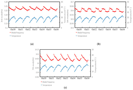 Curves of ambient temperature and modal frequency: (a) curve of ambient temperature and 3rd modal frequency; (b) curve of ambient temperature and 5th modal frequency; (c) curve of ambient temperature and 7th modal frequency.