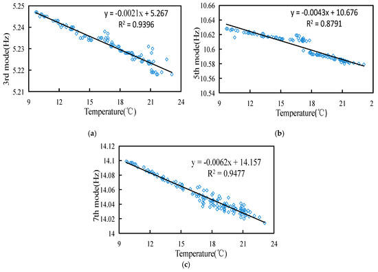 Fitted curves of ambient temperature and modal frequency: (a) fitted curve of ambient temperature and 3rd modal frequency; (b) fitted curve of ambient temperature and 5th modal frequency; (c) fitted curve of ambient temperature and 7th modal frequency.