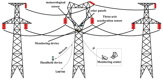 Structural health monitoring technologies are widely used in structural damage detection, including for electric power tower structures. The method of measuring tower inclination with an inclination sensor has been widely used [9]. However, this method can only indirectly reflect the stress of the large deformation of a tower, and parameters of load balance, stealth faults (such as the small deformation of the tower) or the yield failure of the local rod cannot be found in time. Some researchers realized the remote monitoring of tower structure damage by installing strain sensors on the transmission tower [10]. Although the resistance strain gauge can identify the force change of the rod, there are still some problems, such as complex attachment processes, susceptibility to rust and electromagnetic interference on the measuring circuit. Therefore, some researchers use grating fiber strain sensors to improve the range and accuracy of the measurement [11,12]; however, the development of this method is limited by installation quantity, installation location and the direction of the sensor.