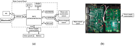The principle diagram of the monitoring device is shown in Figure 14a, including the main control unit (MCU), power module, communication unit (4G/Bluetooth/RS485) and sensors. The power module is composed of solar panels, batteries and controllers, which provide power for the whole system. It has low power consumption and can last for more than 30 days in rainy weather. Sensors include the three-axis accelerometer sensor and the meteorological sensor. The three-axis acceleration sensor is used to collect the vibration response of the tower and the meteorological sensor is used to measure the environmental parameters around the tower. The monitoring device sends the measurement data to the monitoring center and receives the commands from the monitoring center, which include time setting, sampling interval, sampling duration, monitoring device initialization, etc. Figure 14b shows the main control and power supply control panels.
