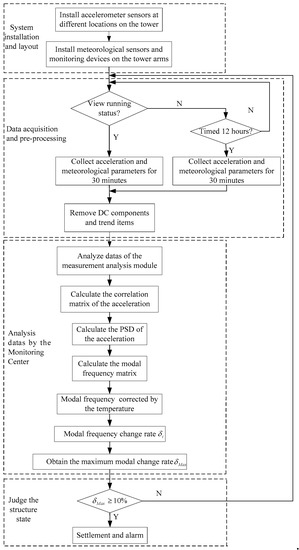 Figure 15 shows a flow chart of the system. After the installation of the device, ensuring that the tower settlement does not occur within one day, the low-order modal frequency matrix of the tower system measured on the first day is used as a parameter when the tower structure is intact. The device can collect the environmental parameters around the acceleration signal of the tower system in real time or at a fixed time. The acquired signal is filtered to remove DC (direct current) components and trend items. The monitoring center analyzes the received signal and calculates the correlation function matrix of the acceleration and the PSD. The stochastic subspace is combined with the stable graph method to obtain the modal frequency matrix of the system. Considering the effect of the temperature on the system, the obtained modal frequency is corrected by the temperature, which is . The modal frequency change matrix is calculated as , and the largest value in the modal frequency matrix is obtained, , to determine if the is exceeded. If it is exceeded, then an alarm is issued.