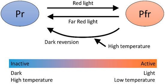 One of the temperature sensors best established and analyzed is phytochrome B (phyB). Phytochrome B is the gene that encodes a light-sensing protein present in two alternative forms, depending on intensity and quality of light [13,14] (Figure 1). The inactive form of phyB, which is called Pr, absorbs maximally at the red wavelength of the electromagnetic spectrum. When phyB Pr is exposed to red light, it changes to the active Pfr form. Active phyB Pfr shows maximum absorbance in the far-red region of the spectrum. Far-red radiation accelerates the rate at which Pfr converts to Pr. The phyB Pfr spontaneously relaxed into Pr independent of light. This phenomenon is called dark or thermal reversion. Under natural conditions, sunlight activates phyB to the Pfr form and phyB becomes inactive at night.