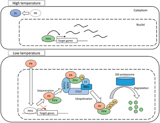 The mechanism of the temperature sensing system based on phyB and PIF4. At high temperature, phyB gets converted to the inactive Pr state and is located in the cytoplasm. The PIF4 binds to the regulatory region of target genes and regulates their expression. At low temperature, phyB is in an active state and enters the cell nucleus. The PIF4 is sequestrated from target genes by binding to phyB. The PIF4 is degraded by 26 proteasomes through ubiquitination. The activity of PIF4 is suppressed at low temperature.