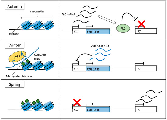 The mechanism of vernalization was analyzed using Arabidopsis, in which a floral repressor FLOWERING LOCUS C (FLC) represses differentiation into floral stage by suppression of FLOWERING LOCUS T (FT), which is a component of florigen, the flowering inducing factor [35,36] (Figure 3). This suppression was overcome by COLDAIR, which is a long noncoding RNA transcribed from the first intron of FLC [37]. COLDAIR started to express after transition to cold temperature and its expression peaked 20 days later, decreasing thereafter even under prolonged cold conditions. COLDAIR RNA formed secondary structures and bound to Polycomb Repressive Complex 2 (PRC2). This is one of the chromatin-remodeling complexes that regulate transcriptional activity by modulating chromatin state of target genes in the genome [38,39]. COLDAIR-PRC2 complex bound to FLC region and suppressed FLC expression through conversion of chromatin into the inactive state through histone methylation [40]. As a result of the suppression of FLC, the expression of FT and other flowering-regulating genes were able to activate in a subsequent warm period, thereby initiating flowering-associated differentiation. Although the pathway that promotes flowering by the cold signal was identified, the regulation of COLDAIR expression and chromatin modification in response to low temperature is not clear. Temperature sensing components that are not yet known might be involved in this pathway.