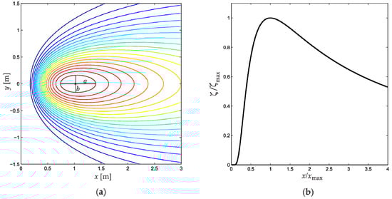 In practice, Equation (5) is a useful expression because it includes easily measurable quantities frequently found in this kind of plumes (maximum concentration and its position). In addition, the turbulent diffusion coefficient and velocity are not directly involved, so that it is not necessary to measure them. Equation (5) defines a concentration surface whose isoconcentration lines are shown in Figure 1a, with the values g/m3, m and m. As expected, the maximum concentration is found along the x-axis at the position. It is important to mention that both the maximum concentration and source positions are along the -axis, which simplifies the experimental localization problem from 2D to 1D. Therefore, if we consider in Equation (5) the concentration profile along the -axis is: