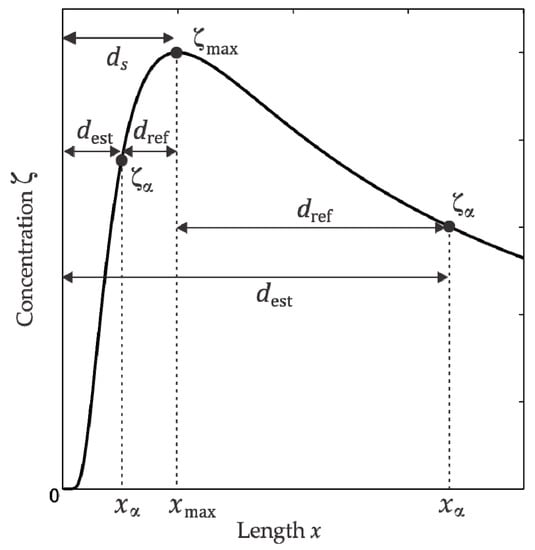 The distance in Figure 2 is easy to measure since it represents the segment between the maximum concentration point and the point on the -axis. Depending if is to the left or right respect to , the cases and are distinguished, as Figure 2 shows. Therefore, the distance to the source on -axis from the maximum concentration position can be defined as: