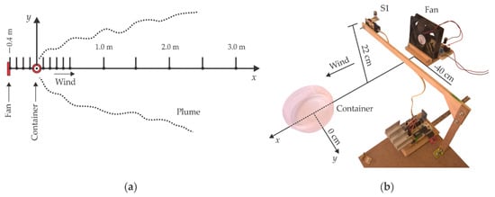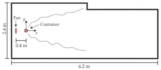 The experiments were performed inside a 2.40 m × 6.20 m room as shown in Figure 5. The fan was located at a distance of 40 cm from the container center ( cm) generating a velocity above the container of 0.97 m/s, which is an acceptable value [10,32]. The fan-container arrangement produced a gas source with an approximately constant emission ratio of 0.46 mL/min. The environmental conditions in the room were 23 ± 2 °C and 35 ± 5% RH.