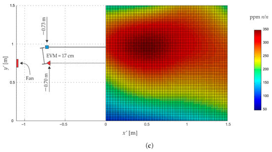 Figure 10c shows the concentration distribution in the mapping area together with the container and the fan locations. The center of the container is presented as a triangle and the estimated location by applying Equation (13) is presented as a square. The error vector magnitude (EVM) is the deviation between the estimation and the actual container position in the area. In this case such deviation was 17 cm.