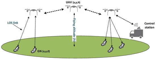 where is the received power at a given distance. In Equation (1), is the reference distance and is the path loss exponent. UAVs are assumed to have the same operating characteristics, featuring the same transmit power, antenna gains, and enough energy storage to complete the mission, and they may fly at different altitudes. GNs can only communicate with each other through UAVs. Assuming communication between a GN and a UAV, d is computed as the Euclidean distance between their transceivers as follows:
