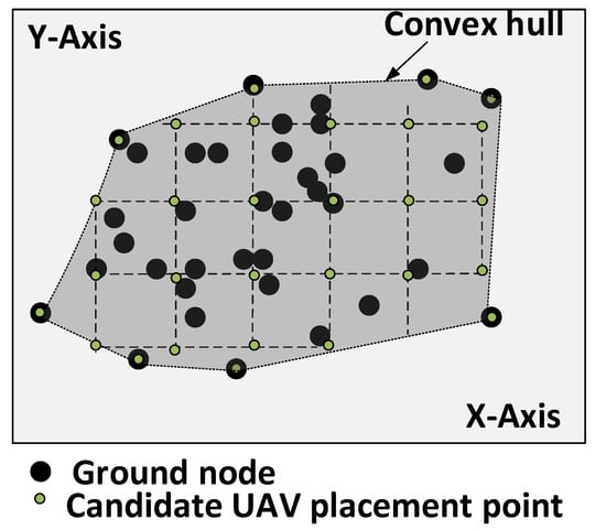 We start by identifying a set of potential UAV placement points Q, by finding a sub-area , which corresponds to the area inside the convex hull (convex envelope) [] formed by the GNs in , as shown in Figure 2. We compute the convex hull to reduce the search space of the UAVs’ placement points in the target area. We intend to cover all GNs in . Therefore, we discretize in a grid layout according to Equation (4).