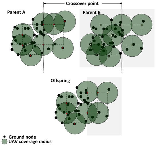 A fitness function decodes the solution represented by a chromosome and lets us know how far we are from the optimal/ideal solution if it is known. In MOEA, there will be a fitness function for each objective space. Equations (5) and (9) compute the fitness for the number of UAVs and degree of dissatisfaction, respectively. Values scored from both objective functions are used by NSGA-II to set the ith front.