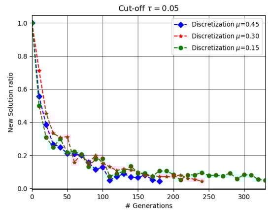 The MOEA termination adopted in this work is similar to that used in [], in the sense that we also maintained an external archive of non-dominated solutions obtained at some predefined steps at earlier generations, and it was subject to be updated some generations later. However, instead of computing the ratio of the number of solutions in the archive that were dominated by the new ones of the current generation and the ratio of the number of solutions that were also present in the new set of non-dominated solutions, we computed the ratio of new solutions, which were not present in both dominated and non-dominated sets of the archive, and we used it to define our stopping criterion. We used as the cut-off value for the new solutions. However, the choice of the exact cut-off value may depend on the problem and may require some trial and error. Figure 6 shows the ratio of new solutions at every tenth generation (i.e., step = 10). The ratio was significantly high in the first generation when the algorithm was evolving and decreased with the generation, as new solutions were not frequent. We also observed that depending on , NSGA-II took a different number of generations to achieve the cut-off value. In fact, the value of affected the cardinality of Q, hence increasing or decreasing the search space, i.e., the higher the cardinality of Q, the higher was the number of generations to achieve the cut-off value. On the other hand, the lower the cardinality of Q, the lower was the number of generations to achieve the cut-off value. These results are shown in Table 5.