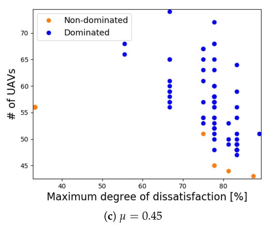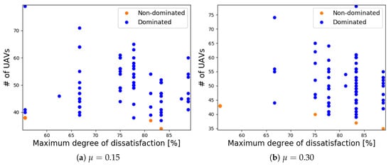 For each value of , all dominated and non-dominated solutions are presented in Figure 7. From each Pareto front set, we can clearly see the trade-off between the number of UAVs that are flying in the area and the degree of dissatisfaction of the GNs in terms of the required data rate, i.e., when few UAVs are deployed, a high degree of the maximum dissatisfaction was observed. On the other hand, when the number of UAVs increased, the degree of the maximum dissatisfaction decreased.