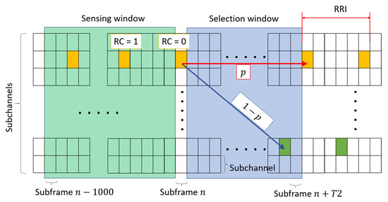 When RC reaches 0, the next streak should be scheduled. This operation is called reselection. First, a decision is made as to whether a different resource should be chosen from the selection window using sensing again or the current resource location is kept. In the latter case, the same RRI is maintained between the last packet in the current streak and the first packet in the next streak. The decision is controlled by the resource keeping probability probResourceKeep that the upper layers configure [20]. For the decision, a random number in the interval is generated, and if it is larger than probResourceKeep, a different resource should be used for the next streak. Otherwise, the UE continues to use the current resource. In either case, however, a new RC counter value should be decided as above, according to the RRI. Figure 1 shows an example where the UE is at the point of deciding whether it should change the resource location with probability or it should maintain the current resource for another streak with p. The standards stipulate that the probability p in the figure, probResourceKeep, should be configured to be between 0 and 0.8.