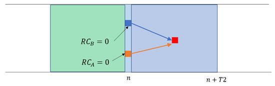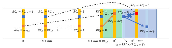 We propose that we take a more direct approach to removing uncertainty in the SPS algorithm while not undermining the necessary randomness in standard parameters. Specifically, we let each packet carry the resource location information for the next streak of packets. Moreover, we require each UE determine the location before the current streak ends. Please note that in the original SPS algorithm, the location is determined just before RC reaches 0 [20]. We call this scheme SPS/LA for “SPS with lookahead”. Unlike Bonjorn et al. [32], we try to realign only the individual single-subframe resources with the same individual resource location determined as the starting location for the next streak. Since such information is available earlier than the actual movement to the planned location, UEs can have chances to change their decision and advertise the newly adjusted location. In this paper, we let UEs determine the next location at . This is because larger values face more uncertainty in the observation of resource usage. Namely, the resource reservation information by other nodes through their published lookaheads and the current use pattern are subject to changes until , especially when the congestion level is already high.
