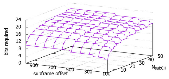 For the simulation experiments, we use the following assumptions. First, the packet size is uniform at 300 bytes, and each packet requires a single-subframe resource. (For the optimization focusing on the uneven packet sizes, readers are referred to Molina-Masegosa [33].) Second, the sensing-based candidate resource selections (i.e., and ) have been already performed, at which instant our simulation starts. Packets are periodically transmitted every ms. Following the standard, we set the RC range at . For the selection window, we set . We turn off the retransmission, so each BSM is transmitted only once. For the resource pool, we assume that a 20-MHz channel at 5.9 GHz is completely dedicated to Mode 4 using adjacent PSCCH + PSSCH subchannelization. We assume that there are subchannels of 8 RBs each are defined per subframe. The maximum number of UEs is 2500 if their RRI is 100 ms, and 500 if RRI is 20 ms. The simulation parameters are summarized in Table 1.