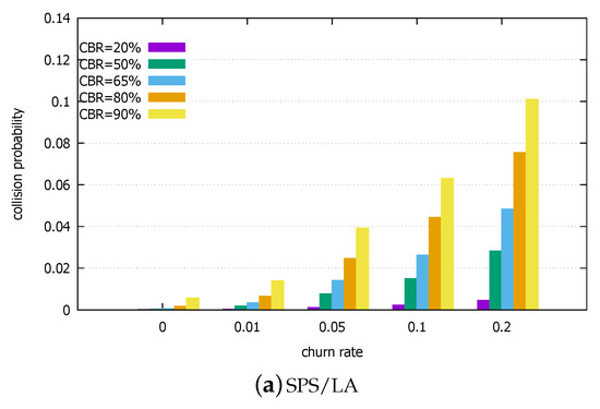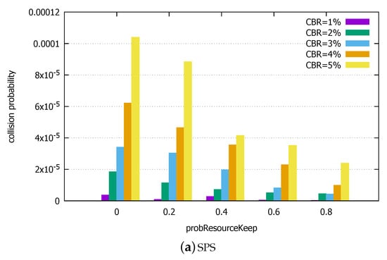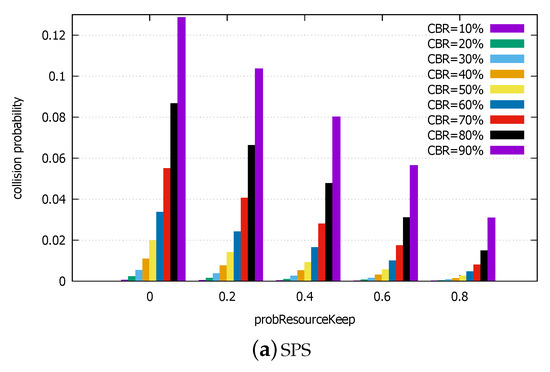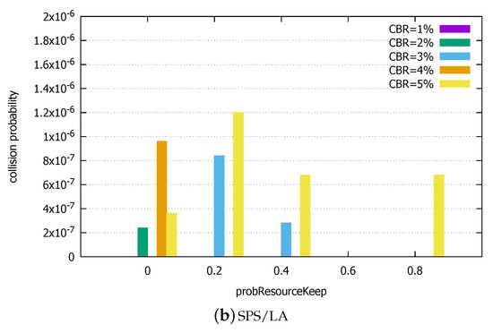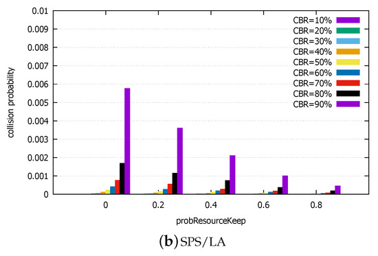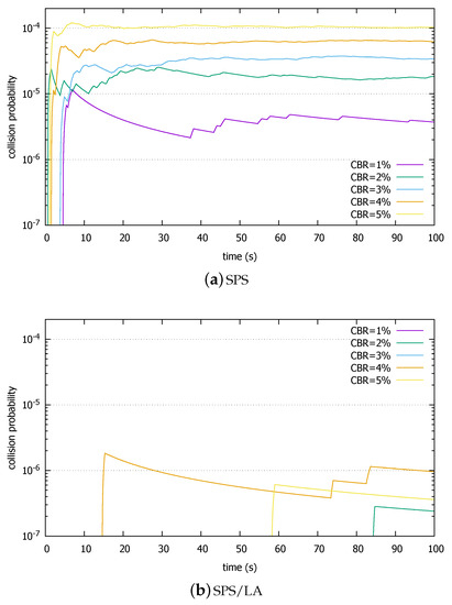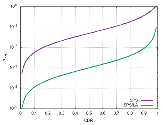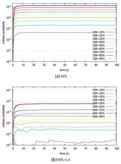 Now, we increase the CBR. Figure 8 shows the results. We notice that the collision probability far exceeds in SPS even for 10% CBR. This number is important because some prominent applications envisioned for 5G eV2X require 99.99% reliability (Table 3) [40]. 5G eV2X will probably use a different radio resource format, but still the SPS performance is disappointing. When the CBR reaches 90%, the collision probability is 12.8%. In SPS/LA, we notice that the collision probability is reduced by a factor of 10 or more compared with the original SPS. Again, this result is in line with the reselection collision probability analysis. In particular, the SPS/LA scheme keeps the probability under until the CBR exceeds 40%. Even when the CBR increase further, the performance gap between the two algorithms is maintained at more than an order of magnitude. For an extremely high CBR of 90%, the collision probability under SPS/LA is still under 0.6%, compared with 12.8% under SPS.