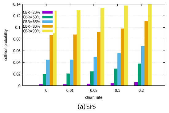 Figure 11 shows the results. We observe that with the churn rate increasing, the collision probability increases in both schemes. This is in line with the observation made by Bonjorn et al. [32]. It is expected because under our harsh assumption above, the initial collisions are not preventable. We also observe that SPS/LA is more heavily affected by the harsh assumption. It reflects the fact that the SPS/LA scheme effectively controls the other type of collisions, namely those arising from the lack of coordination among vehicles as to the resource reselection in SPS. In contrast, the SPS performance only slightly degraded. It implies that for the SPS without the lookahead, most of the collisions are of similar blind nature to the newly joining vehicles in this experiment. Overall, the SPS/LA performs better than SPS, even with very high churn rates.