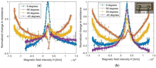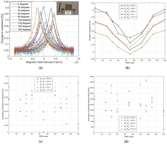 The scatter plots given in Figure 4c,d illustrate the range of reproducibility of the AMR response of the sensor set. While the asymmetry of peak magnitude is below of the maximum AMR sensitivity, the asymmetry of absolute peak location is on average for all angular configurations. For all sensors, we found that the absolute peak locations of all angular configurations deviate from each other in the range of 250–850 . These measures dictate the minimum range of magnetic field intensity that is necessary to operate the sensor.
