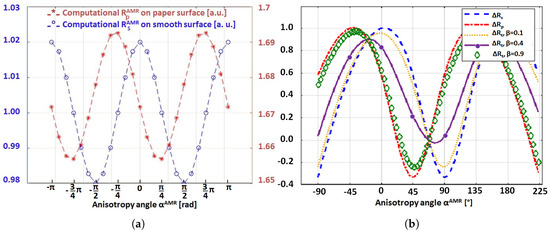 (a) Magneto-resistive response of a NiFe coating on a completely fibrous paper surface, at , compared to the response of a NiFe coating on a smooth surface, at . The change of magneto-resistance is expressed in arbitrary units. (b) Resulting %-change of AMR in dependence of the anisotropy angle for .