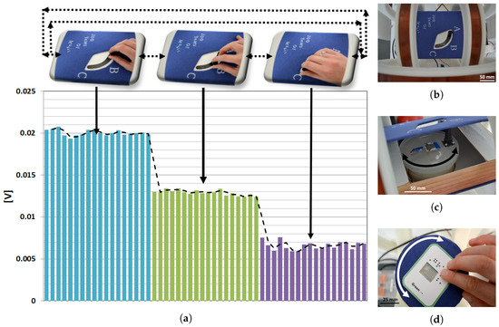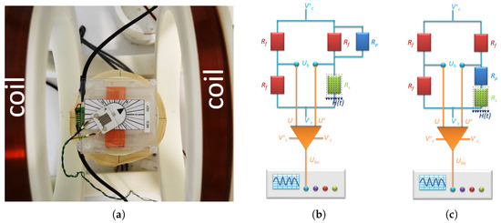 where is the resistance at zero magnetic field, H is the density of the magnetic field and denotes the varying component of the total resistance. Here, the density of the magnetic field, H, is measured through an induced voltage in a measurement coil placed in the proximity of the sensor. While the orientation of the external applied magnetic field is fixed, we rotate the AMR element within the field (Figure 8a). At the balanced state of the WB and in the absence of an external magnetic field, we adjust the resistance of the potentiometer such that the circuit exhibits zero voltage ( = = 0). In the presence of a magnetic field, the resistance of the magneto-resistive element changes () and constitutes the unknown resistance in the WB. Obtained from the left and right arms of the WB, the ratio between the input voltage V and the input voltages of the amplifier and are given as