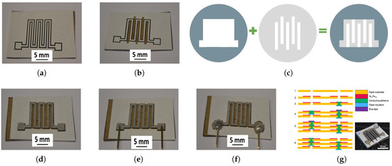 Photographs of (a) printed sensor pattern on paper substrates, (b) cuts of paper segments corresponding to gaps between inner pattern details of sensor, (d) sputter deposition of NiFe after alignment of the paper substrate with the shadow mask, (e) positioning and fixation of the electrodes, conductive adhesive bonding of electrodes to (f) the meander, and (g) the sensor stack. The method for patterning a sensor during sputter deposition using the combination of a shadow mask to pattern the outer frame of the meander and micro-machining to cut out inner segments from the paper material, is shown in (c).