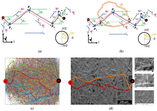 As for modeling the path of the electrical current across the NiFe coating, we propose the geometrical configurations as sketched in Figure 7a,b. Starting at the cathode C, the electrical current flows along a possible fiber path (C, , A), comprised of nodes and the center axes of the fiber segments (, ), towards the anode A. Each axis of fiber segment is characterized by a length and an orientation angle such that and is the orientation vector of the fiber segment.