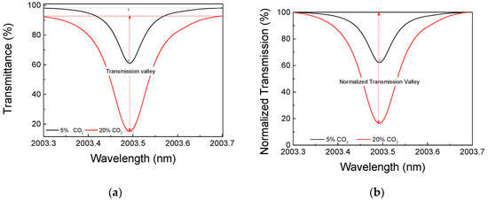 (a) Transmittance around 2003.5 nm for CO2 concentrations of 5% and 20% across a 74 cm long cavity at total pressure of 1 atm; (b) normalized transmission; (c) normalized transmission valley as a function of CO2 concentration.