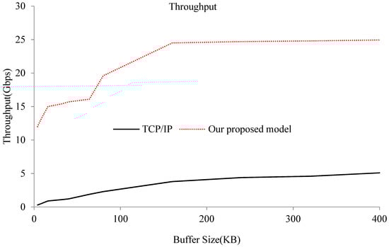 Figure 2 shows the throughput comparison of the optimized model and traditional TCP/IP communications. The experimental results show that, compared to the traditional TCP/IP communication, our proposed optimized model had much higher throughput capacity for different buffer sizes. Our optimized approach improves the throughput capacity up to 24 Gbps (the upper limit of the data-access performance of underlying memory modules), which is increased by about five times compared to a traditional TCP/IP-based solution. This means that our optimized approach can exploit the hardware capacity of the underlying memory modules for interdomain communications and it has better communication performance for use in applications that require frequent communication. When buffer size increases, the throughput of both the TCP/IP-based solution and our proposed approach increase accordingly. However, our proposed approach always outperforms the TCP/IP-based solution.