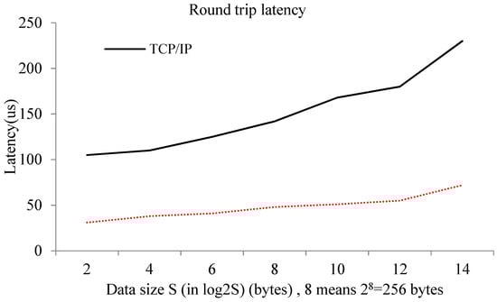 Another important performance indicator of the communication between different guest VMs on the same physical machine is delay. In order to prove that the optimized model is more efficient than a traditional TCP/IP communication approach, the round-trip delay when two VMs send different sized messages to each other (taking into account the impact of bandwidth, the value of the transmission message size is much smaller) needs to be tested. Each experiment was implemented 100 times, and then the average round-trip latency over all experiments was determined. The experimental results are shown in Figure 3.