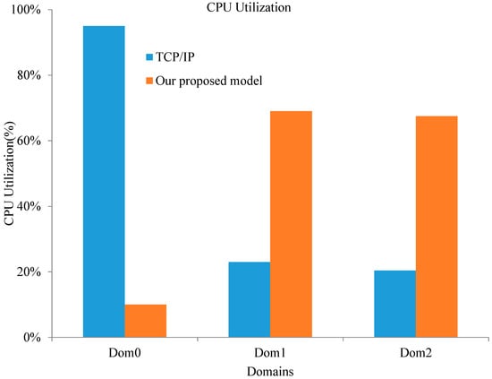 In order to prove that our optimized model is more efficient than the normal TCP/IP mode, evaluations were also performed to test the CPU utilization of the domains. When data were transferred, we collected the CPU utilization of Dom0 and DomU by using the xentop command. The command is xentop -b 1 -i 200 | awk ‘BEGIN {print “name cpu%”}{ print $1“ ”$4}’. This command evaluation sets the update time to 1 s and the number of iterations to 200, then it prints the collected CPU utilization data through awk. Finally, we calculated the average CPU utilization of each virtual domain. The experimental results are shown in Figure 4.