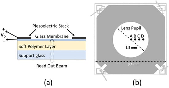 Figure 1 shows the simplified structure of the cross section of a Tlens®, a micro-lens featuring a piezoelectrically tunable focal length. In particular, the devices tested in this work were developed by poLight ( Horten, Norway) and STMicrolectronics (Agrate Brianza, Italy) [] and kindly mounted on a board by STMicroelectronics. The Tlens® is a micro-optic component, realized with MEMS technology, which is formed by three optically transparent layers, aligned in quiescent conditions: 100-µm-thick glass support, 300-µm-thick soft polymer layer, 20-µm-thick glass membrane []. A ring-shaped piezoelectric actuator (1μm thick PZT53/47 thin film [,,]) is fabricated on top of the thin glass membrane by thin film piezoelectric technology, leaving a circular transparent pupil at the center of the device with a diameter of approximately 1.5 mm. The device footprint is approximately less than 5 mm by 5 mm.
