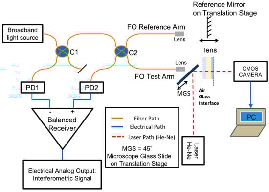 Reflectometric set-up. PD1, PD2: Photodiodes; C1, C2: 2 × 2, 50:50 fiberoptic coupler. FO—Fiberoptic path. MGS—Microscope Glass Slide on translation stage.