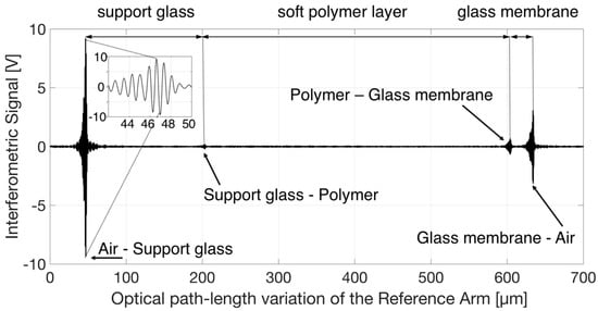 The structural characterization of the Tlens® consisted of detecting the optical thickness, or optical path-length, of each single layer, in a non-invasive and non-destructive way, so that the measurements could be performed multiple times without any damage to the lens. For accomplishing this task, we employed a Tungsten lamp, an ultra-broadband read-out source previously exploited for the structural testing of other devices [,]. Although the fiber-coupled optical power was low, its short coherence length, of the order of a few microns, ensured a suitable longitudinal (or in-depth) resolution for selectively detecting the relative position of the inner interfaces, despite the low field reflectivity caused by the small refractive index step among glass and polymer. By longitudinally translating the reference mirror (at constant velocity v = 10 µm/s with a computer controlled, motorized linear translation stage), the optical path-length of the Reference Arm was increased. The analog output of the balanced receiver was digitally converted, acquired in the time domain by a personal computer and then translated into optical path-length variations. Amplitude-modulated, interferometric fringes were observed when the Reference Arm length matched the optical path-length on the Test Arm up to each interface within ±2 µm. A typical result of this scan is reported in Figure 3, which shows the acquired interferometric signal as a function of the optical path-length variation of the Reference Arm. Four groups of fringes, amplitude-modulated by the fringe visibility function that mainly depends on the line-shape of the emission spectrum of the source, can be recognized. Moreover, the envelopes of each fringe group exhibit different peak amplitudes. The group with the highest peak-amplitude is due to the signal being back-reflected by the first crossed interface between air and support glass. Another high peak is related to back-reflection coming from the interface between glass membrane and air. Whereas the glass membrane has an anti-reflection dielectric coating for visible light, it does not prevent reflection of near-infrared light. The interfaces between glass and polymer provide back-reflected signals that generate two separate groups of fringes with much lower peak amplitude, which is expected due to the similar refractive indices of these materials. The envelope peak amplitude of the last fringe group is lower than the envelope peak amplitude of the first fringe group, though it is an air–glass interface, due to the fact that the fraction of the field amplitude reflected by the last interface and coupled back into the readout fiber is lower than that reflected at the first air–glass interface. There are optical losses at each interface, due to reflections and refractions. Moreover, the back-coupling efficiency on both the Reference and Test arm, at the optical distance corresponding to the further glass–air interface, becomes lower due to the limited working distance of the aspheric lenses placed on the tip of the readout optical fibers. Although we do not know the exact values of the refractive indices of both glasses, we know that the thin glass membrane has a higher refractive index than that of the supporting glass. The optical thickness of the various layers measured in the center of the Tlens® was then obtained as the optical distance between the groups of fringes. As a matter of fact, the position of the peak is a precise indicator of the moment when the interferometer paths are equal for any given reflection. By relating the position of the peak with the position of the Reference arm, the separation of the interfering reflection can be determined. The following values for the OTs can be estimated from the reported data: OT of Support Glass is 156 µm, OT of Polymer layer is 400 µm, OT of Doped Glass is 30 µm. To the best of our knowledge, the group refractive indices of the materials composing the various layers are in the range 1.5–1.6 RIU (Refractive Index Unit). Thus, remembering that OT = ng × d, where ng is the group refractive index and d the geometrical thickness, assuming for ng an intermediate value, we obtain that the support glass geometric thickness is of the order of 100 µm, the polymer layer thickness is of the order of 257 µm, and the glass membrane geometric thickness is of the order of 19 µm. The inset in Figure 3 reports a zoom of the signal that shows the amplitude-modulated fringes. The distance between two consecutive minima or maxima corresponds to an optical path variation of λc/2, where λc is the center emission wavelength of the read-out source, in this case λc = 1.57 µm.