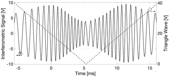 Interferometric signal (black continuous trace, left axis) and triangle driving wave (black dashed trace, right axis) as a function of time. The interferometric fringes appear amplitude modulated by a gaussian visibility function, as expected using the SLED due to its Gaussian emission spectrum.