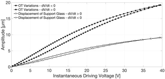 The displacement of the support glass was finally reconstructed as a function of the instantaneous value of the piezo-actuator driving voltage by fringe counting with a λ/8 = 169 nm resolution, that is by detecting the voltage corresponding to all the maxima, minima, and zero crossings of the interferometric signal. The result is presented in Figure 5. Hysteresis in the position assumed by the glass support, with respect to the starting condition, for increasing and decreasing voltages, is clearly visible in this graph as the trace relative to the amplitude of displacement obtained for dV/dt > 0 (white filled markers △) is not superposed to the trace relative to the amplitude of displacement attained for dV/dt < 0 (white filled markers ▽). The detected displacement and the hysteretic cycle were found in agreement with the results provided by numerical simulations [,,]. Similar hysteretic behaviors, not strictly related to the device shape and structural materials, were reported by other authors in [,,].