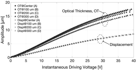 For this investigation, the reference mirror position was selected and fixed in order to attain the peak of the fringe group relative to the interface between glass membrane and air, thus the furthest position away from the fiber termination, with approximately half of the driving voltage peak. The interferometric signal and triangle driving wave in the time domain were also acquired in this case with a digital oscilloscope; the reconstructed optical thickness variation as a function of the instantaneous driving voltage is reported in Figure 5, directly compared with the displacement of the support glass previously described. The amplitude of OT obtained for a given voltage for dV/dt > 0 (black filled markers ▲ in Figure 5) is different from the one attained for the same applied voltage, but dV/dt < 0 (black filled markers ▼ in Figure 5). OT variations are much larger than the displacement of the support glass due to the soft polymer deformation. Moreover, they assumed smaller values moving the spot of the readout beam from the center towards the border of the lens pupil (in the positions indicated in Figure 1b), as shown in Figure 6, due to the curved shape of the induced deformation (as expected for a convex lens). It should be noted that when considering only the glass membrane with the piezo-actuator, thus without the polymer layer and the support glass, the displacement obtained by monitoring the air–glass front interface did not differ from the OT variations measured by monitoring the glass–air back interface. In that case, the optical thickness change of the glass layer induced by the thin-film piezo-actuator was well below the resolution of the implemented method.