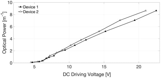 Optical power as a function of the DC driving voltage applied to the piezo-actuator. Results obtained for two different Tlens® devices.