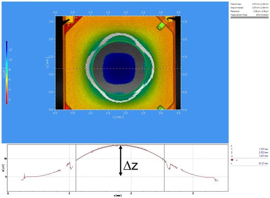 The camera software allowed monitoring of the intensity of the laser spot on the CMOS sensor and identification of the approximate range of DC voltage that contained the focusing value. Pictures were usually acquired for 10 increasing voltage values in this range, with 100 mV steps. These images were then elaborated through a MATLAB code to find the one with the maximum intensity value; the corresponding applied voltage was the closest value (with an error of ±50 mV) to the required driving voltage to focus the input collimated beam in the selected position. Figure 7 shows typical results of these measurements and data analysis, depicted in terms of Optical Power in m−1 (or diopter) as a function of the applied voltage. Experimental values, collected with our direct method, were compared with the values calculated by processing the curvature radius of the lens surface provided by topographic measurements with a Polytec Micro-System Analyzer MSA 500 (a laser vibrometer) by Polytech, Waldbronn, Germany. A typical result of this kind of testing obtained on a different sample of Tlens® driven with 20 V is shown in Figure 8. On the z-axis, in false colors, the surface height is shown. The maximum height variation in the center of the pupil is Δz ~ 8.8 µm. From the section line shape, the curvature radius is calculated. Exploiting the lens maker formula, thus with an indirect method, we found (for 20 V driving voltage) a dioptric power of 8 m−1 that is in accordance with the results shown in Figure 7. Moreover, all experimental data confirmed the Optical Power values estimated by means of numerical simulation based on Finite Element Method using COMSOL™ with a fully coupled piezo-electromechanical modeling interface. An example of the output of these simulations is reported in Figure 9, which shows the predicted convex shape assumed by the lens when the piezo-actuator is driven by 30 V. The maximum height variation in the center of the pupil is Δz = 11.348 µm. From the curvature assumed by the lens foreseen by the numerical tool, we could indirectly assess an Optical Power of 3 m−1 for a driving voltage of 10 V, an optical power of 8 m−1 for a driving voltage of 20 V, and an optical power of 11 m−1 for a driving voltage of 30 V. Results of our direct measurements of Optical Power as a function of the driving voltage were also in general agreement with calculated values reported by other authors in [].