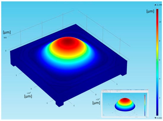 Results of a numerical simulation, based on Finite Element Method using COMSOL™, which predicts the convex shape assumed by the lens when the piezo-actuator is driven with 30 V. On the right, the false color scale for the height reached by the deformed surface of the lens is shown. The maximum height variation in the center of the pupil is Δz = 11.348 µm.
