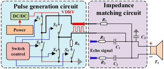 The system is powered by an intrinsically safe power supply (18 V) and produces the required driving voltage VDRV (12 V) via a direct current (DC)/DC converter. The pulse generation circuit is composed of four analog switches and controllers, i.e., S1, S2, S3, and S4. When the positive pulse is driven, the switches S2 and S3 are turned on, and S1 and S4 are turned off. At this time, the positive voltage of the transducer is VDRV, the negative terminal is 0; in the negative pulse driving state, the switches S1 and S4 are turned on, and S2 and S3 are turned off. At this time, the negative voltage of the transducer is VDRV and the positive terminal is 0. When the controller controls the switch to turn on and off with the resonant frequency fs of the transducer, a square wave of amplitude VDRV and frequency fs can be generated at both ends of the transducer, thereby ensuring normal operation of the transducer. After the end of a set of 16 pulses, the controller controls S0 to close, and the damping R0 is connected to the circuit to reduce the ultrasonic “tailing” caused by mechanical inertial vibration, for the purpose of reducing the dead zone.