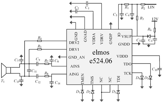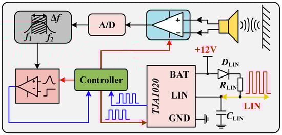 In order to improve the stability and anti-interference ability of the echo-processing system, the reverse current diode DLIN and the LIN matching resistor RLIN are connected in series between the LIN and Battery supply (BAT) pins of the module. The LIN node capacitor CLIN is used to control the voltage fluctuation in the LIN. Moreover, the TJA1020-enabled host application mode is used to receive the master controller’s instructions and return echo information, as shown in Figure 10. The main controller communicate with the echo controller through LIN to control parameters such as amplification gain and echo comparison threshold. The echo controller returns the threshold comparison result and current status information.